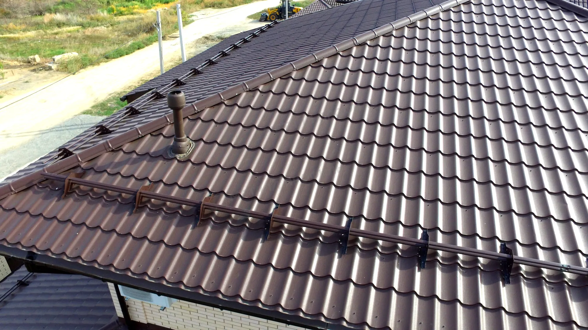 Цвет RAL 8017 добавляет дому уют и солидность, идеально сочетаясь с фасадами из кирпича или дерева. Профиль имитирует натуральную черепицу, повышая визуальную ценность объекта.